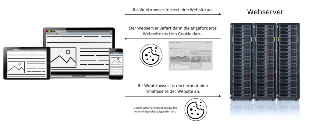 Mit der folgenden Grafik erhalten Sie eine Veranschaulichung, wie die Interaktion zwischen Webbrowser und Webserver bei der Verwendung von Cookies abläuft. Der Webbrowser sendet eine Anfrage an den Server, der daraufhin ein Cookie zurückschickt. Dieses Cookie wird im Browser gespeichert und bei weiteren Anfragen an die Website genutzt, um Informationen zu übermitteln und personalisierte Inhalte bereitzustellen.